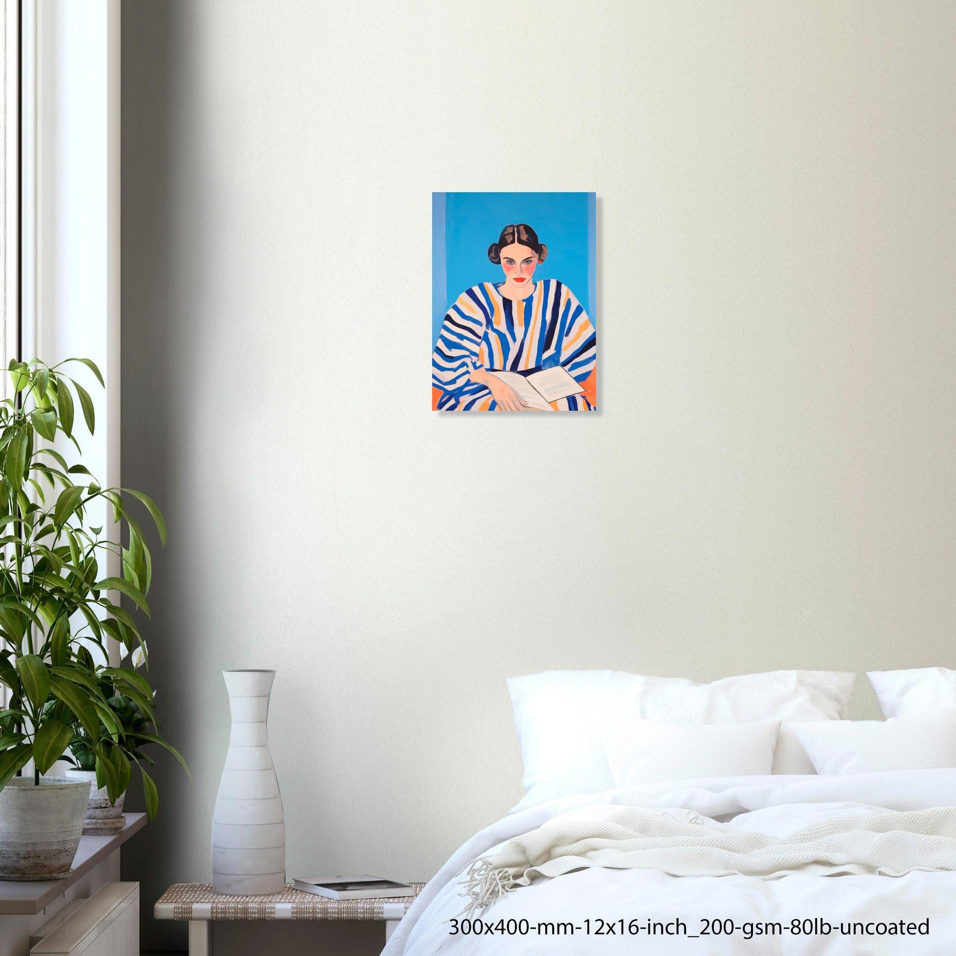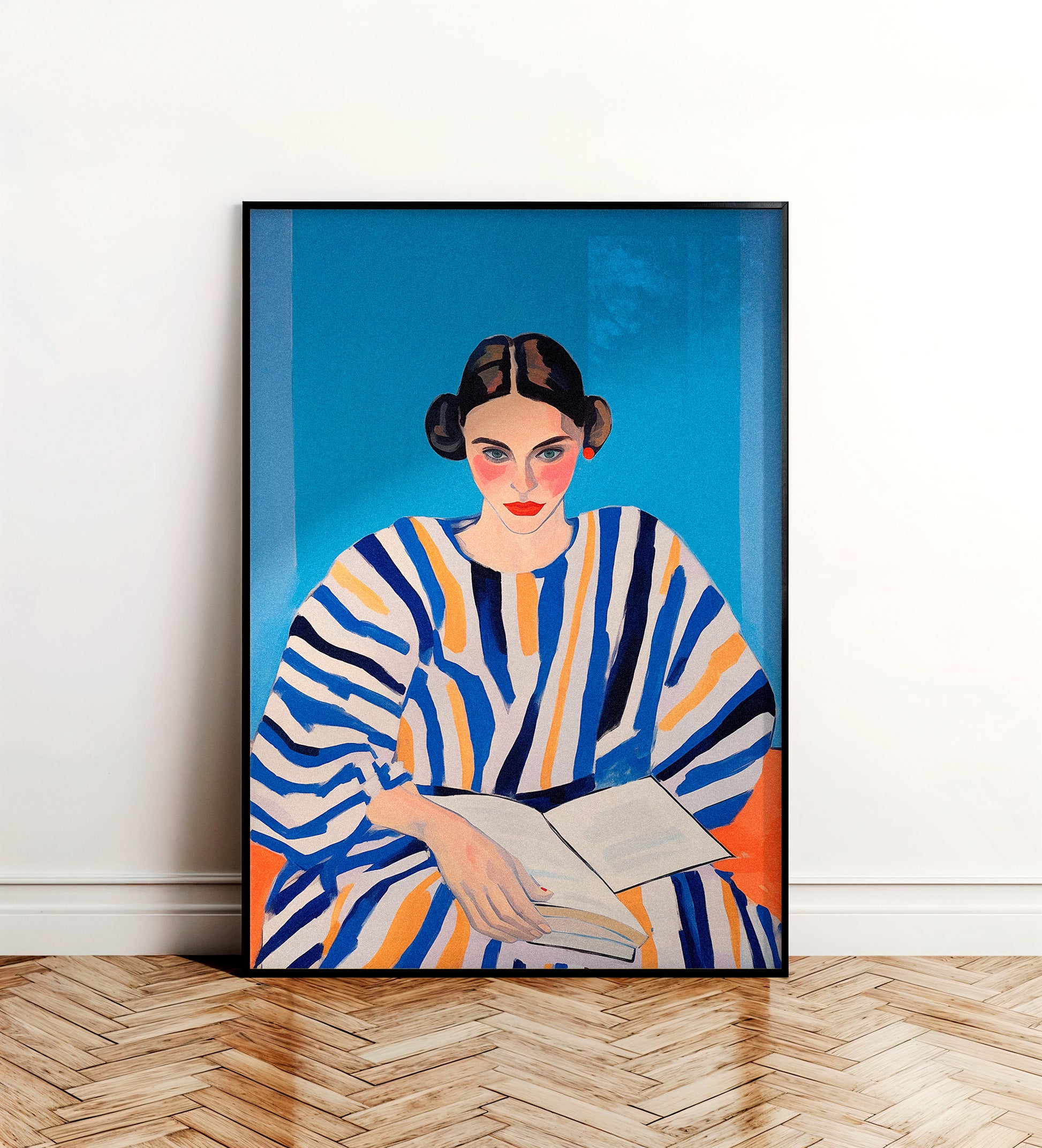 poster mujer leyendo, retrato azul, arte editorial, ilustración moderna, wall art femenino